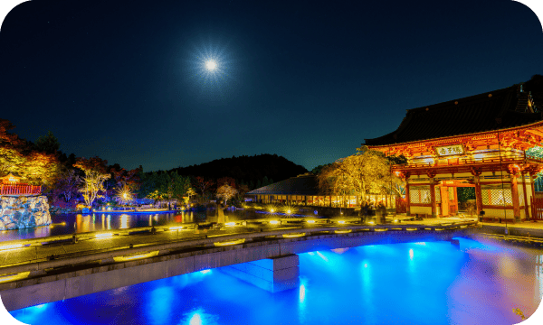 特に秋の紅葉は圧巻で、約8万坪もの境内が鮮やかな紅葉で彩られます。山門を抜けると赤や黄、紫など全山の紅葉が浮かび上がり、背景の深い山々の緑と織り成すコントラストはさながら一幅の絵画のようです。中でも多宝塔へ向かう参道を覆う紅葉のトンネルが人気の鑑賞スポットとなっています(※例年の見頃は11月中旬~12月初旬)。また、11月中の土日祝には期間限定の特別夜間ライトアップ「幻想の世界へ」が行われ、昼の厳かな雰囲気とは趣きの異なる神秘的かつ幻想的な景観が広がります。